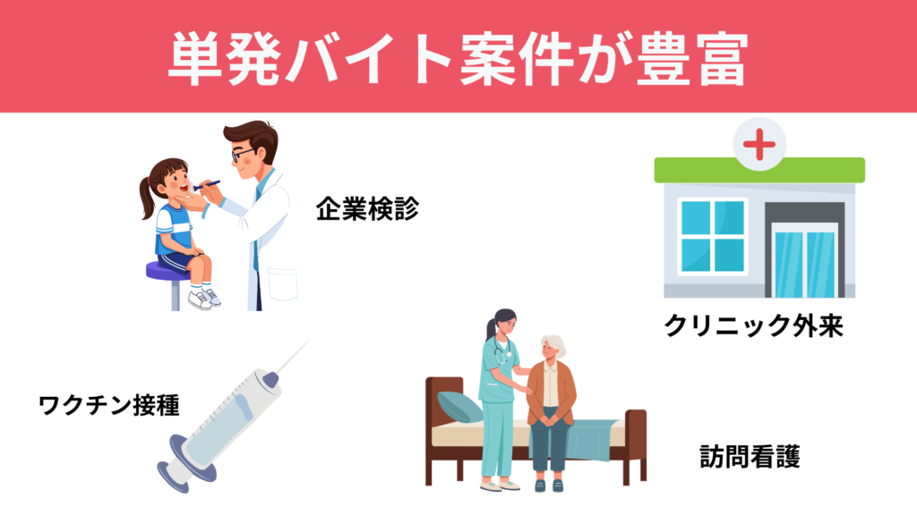 MRT看護師の最大の強みは、首都圏の単発バイト案件の豊富さです。企業健診、クリニック外来、ワクチン接種、訪問看護、イベント救護、美容クリニックなど、多様な案件があります。特に都内の案件は毎日更新され、希望の日程で仕事を見つけやすいです。
